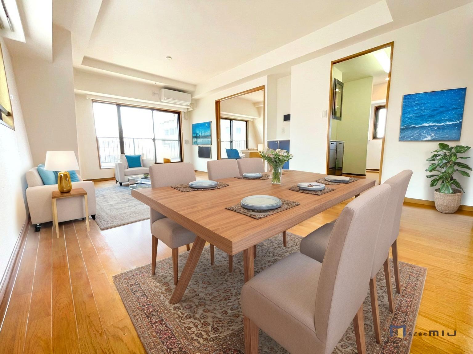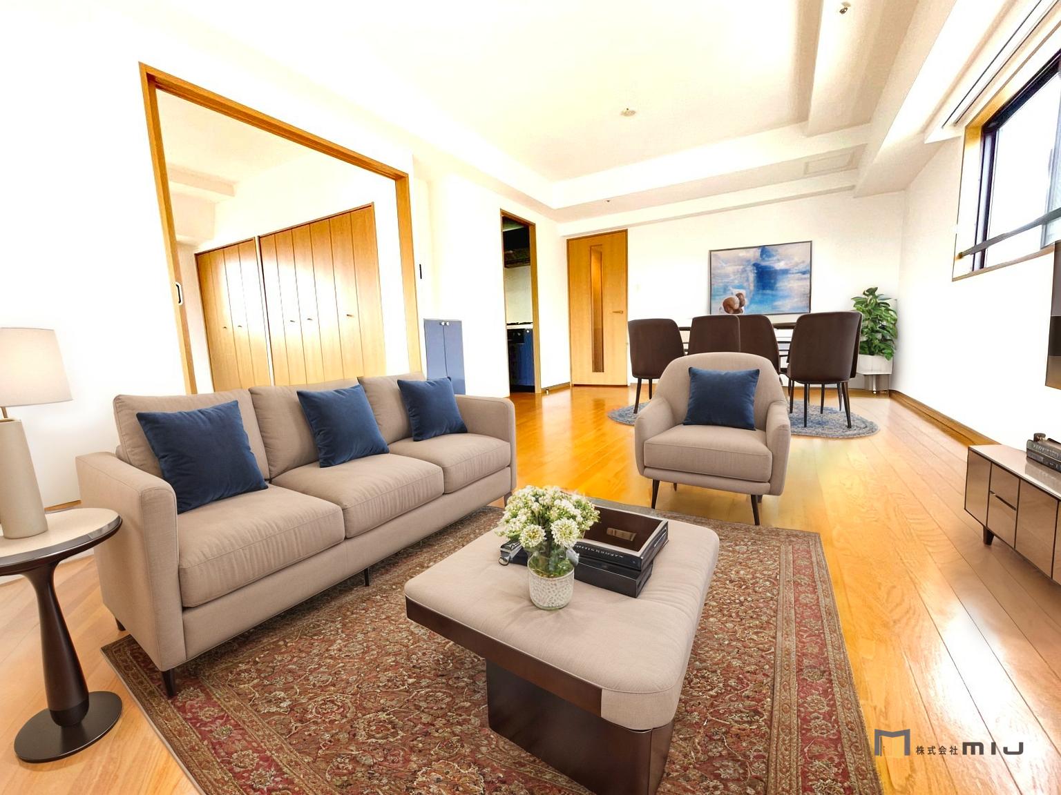 • リビング写真 明るい自然光で満たされる広々と開放感あふれるリビングです。 窓からの眺望も相まってさらに開放感あふれるリビングに♪ ご見学お待ちしております。 TEL:03-6300-0038